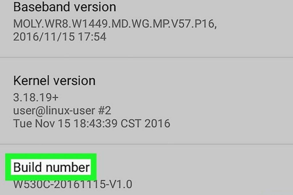 找到“版本号”标题。滑动“关于手机”页面,直到你找到“版本号”选项。根据你使用的安卓设备,你可能需要点击其它菜单才能看到“版本号”部分。如果使用三星盖世设备,你必须要点击软件信息来找到“版本号”标题